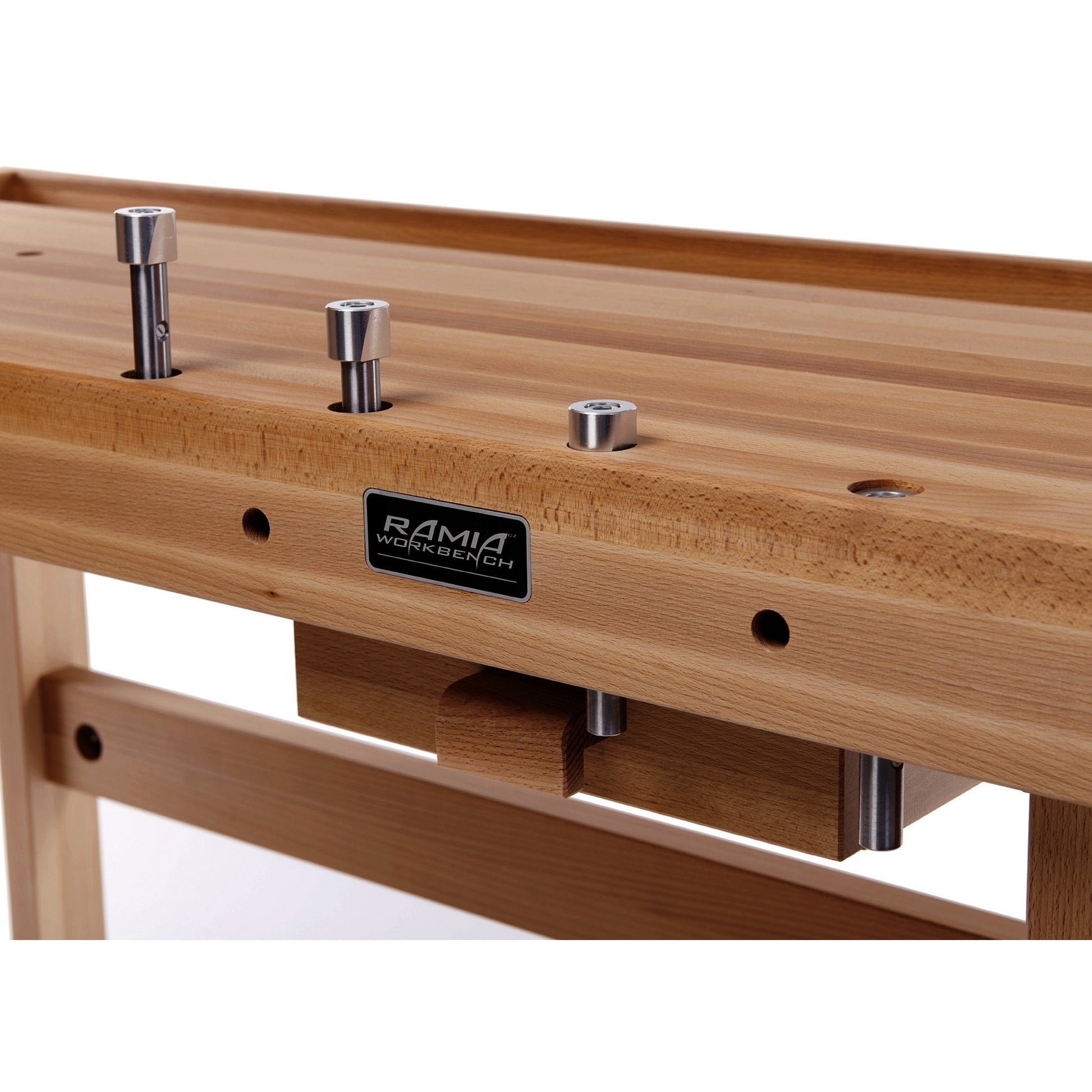The RAMIA Superb 2100 workbench is designed to meet the demands of professional woodworkers, this rock-solid bench features a beech top that's over 3'' thick. Its front vise is chain-gear driven with double spindles to ensure the face remains parallel to the benchtop, and it opens to almost 10''. The tail vise also has double steel rods for smooth, rack-free operation.